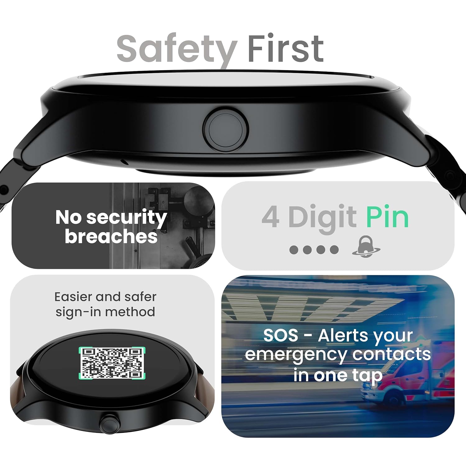 ✅Smart Notifications & Safety Features: Receive SMS and app notifications directly on your wrist. Enhanced safety features include a 4-digit PIN for secure access, a one-tap SOS alert to notify emergency contacts, and secure, easy sign-in methods.