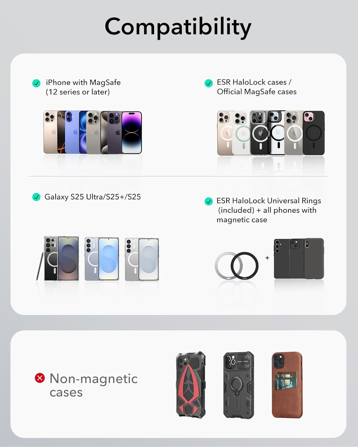 Ultra-Strong Magnets: high-grade N52H magnets with a holding force of 2,300 g keep your phone powerfully in place; combine with an ESR HaloLock case for the strongest magnetic lock of 4,200 g