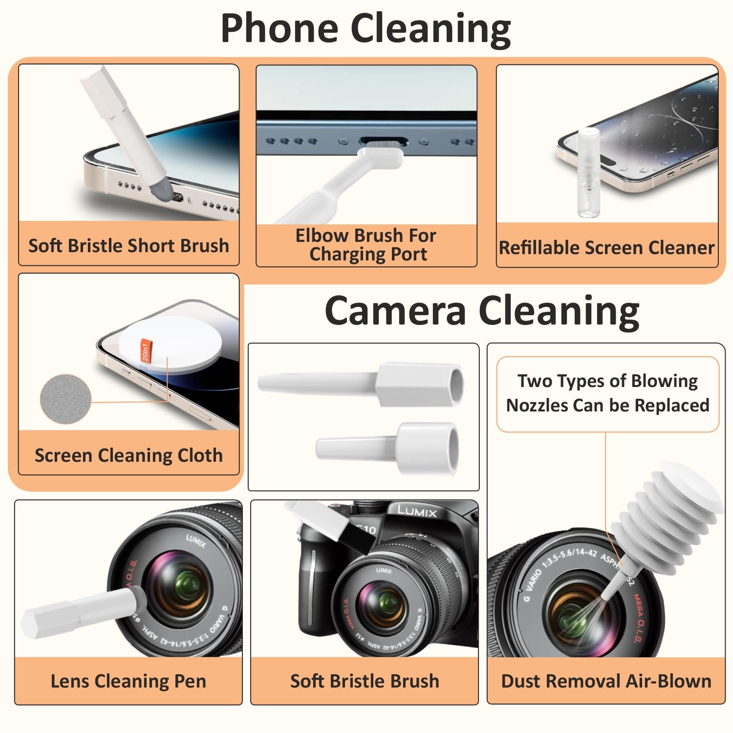 - All-in-One Solution: Includes dust brushes, small brushes, a metal nib, spray nozzle, SIM remover pin, angled tweezers, lens cleaner pen, keyboard key puller, shaft puller, and screen duster.